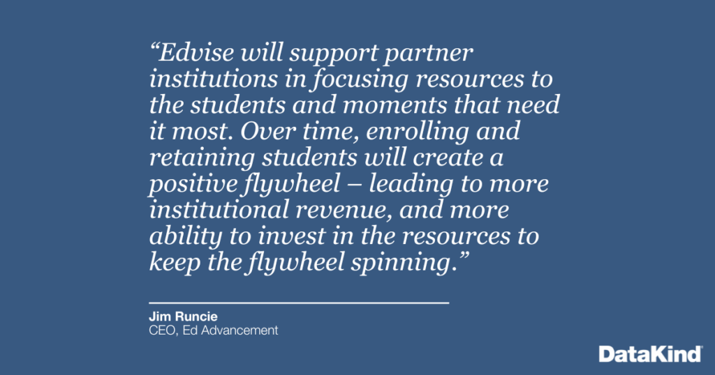 Edvise will support partner institutions in focusing resources to the students and moments that need it most. Over time, enrolling and retaining students will create a positive flywheel – leading to more institutional revenue, and more ability to invest in the resources to keep the flywheel spinning.