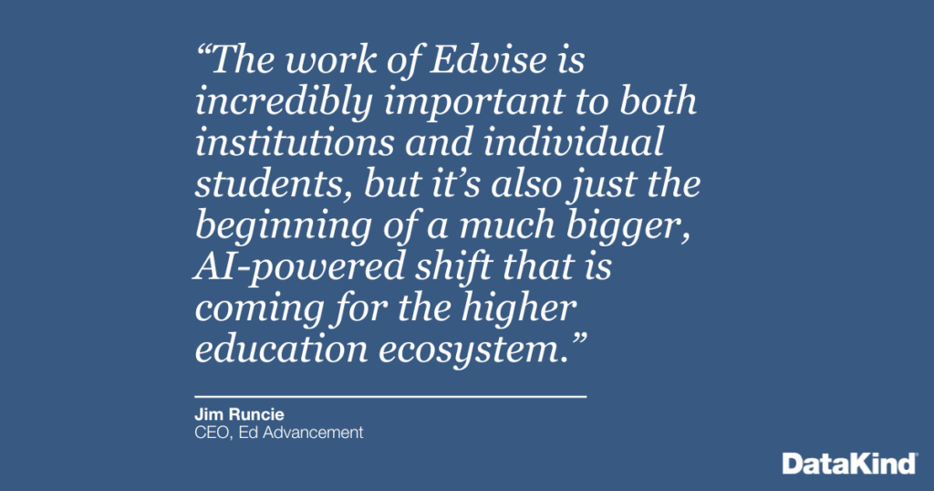 Creating a model where organizations like Ed Advancement can operate as an intermediary, bringing best-in-class partners like DataKind to support the needs of institutional leaders, can help institutions tackle this daunting task. The work of Edvise is incredibly important to both institutions and individual students, but it’s also just the beginning of a much bigger, AI-powered shift that is coming for the higher education ecosystem.