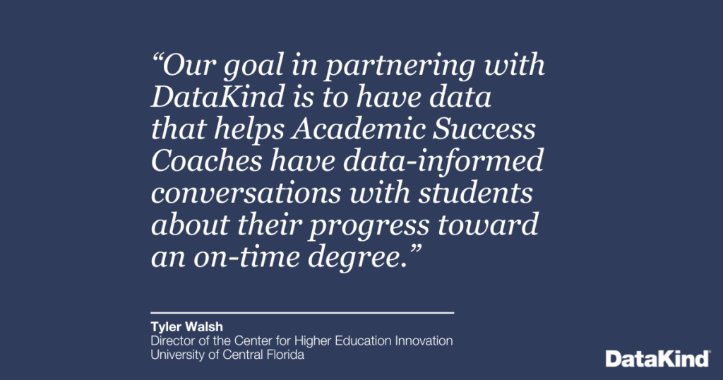 “Our goal in partnering with DataKind is to have data that helps Academic Success Coaches have data-informed conversations with students about their progress toward an on-time degree,” explained Tyler Walsh, Director of the Center for Higher Education Innovation, UCF. “We want to be able to put actionable data that’s personalized to each student in front of Coaches so they can help students make the right decisions on how to reach their academic and career goals.”